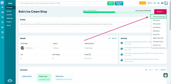- Sales, Production, Finance, Management Dashboard's smart tiles - after clicking any project on a smart tile, you can click Actions > View Client to open the client's page.
