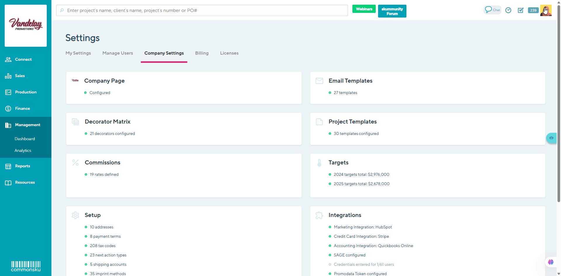 - Click your Profile icon (top right corner of commonsku) > Settings > Company Setting > Integrations > Accounting