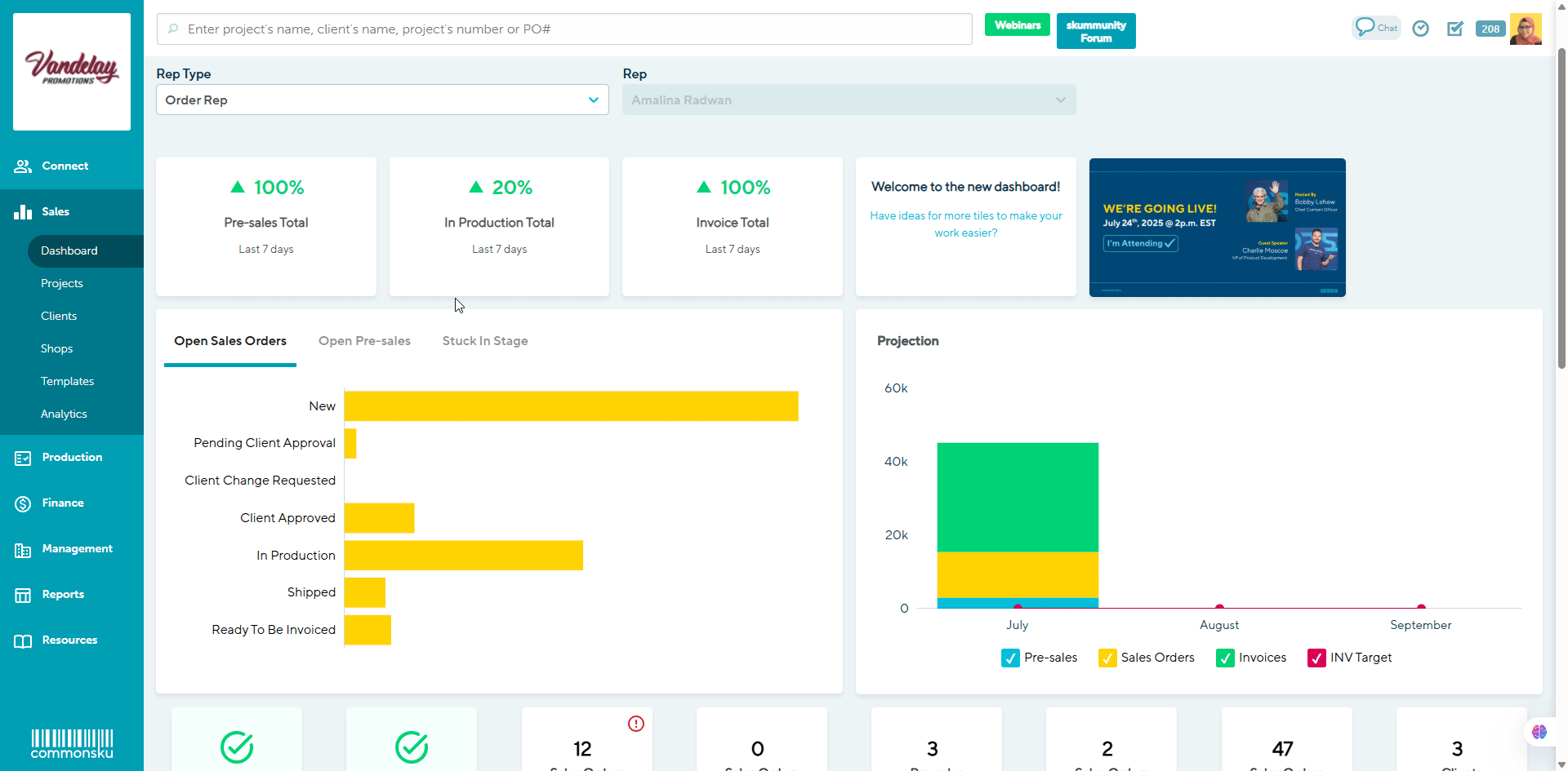 The Dashboard's pre-set smart tiles provide vital metrics that measure the sales rep's performance on a week-by-week basis and compare last week's totals to the current week's numbers. Additional tiles keep tabs on projects missing essential information, like their budget, past-due projects, and orders pending client approval.