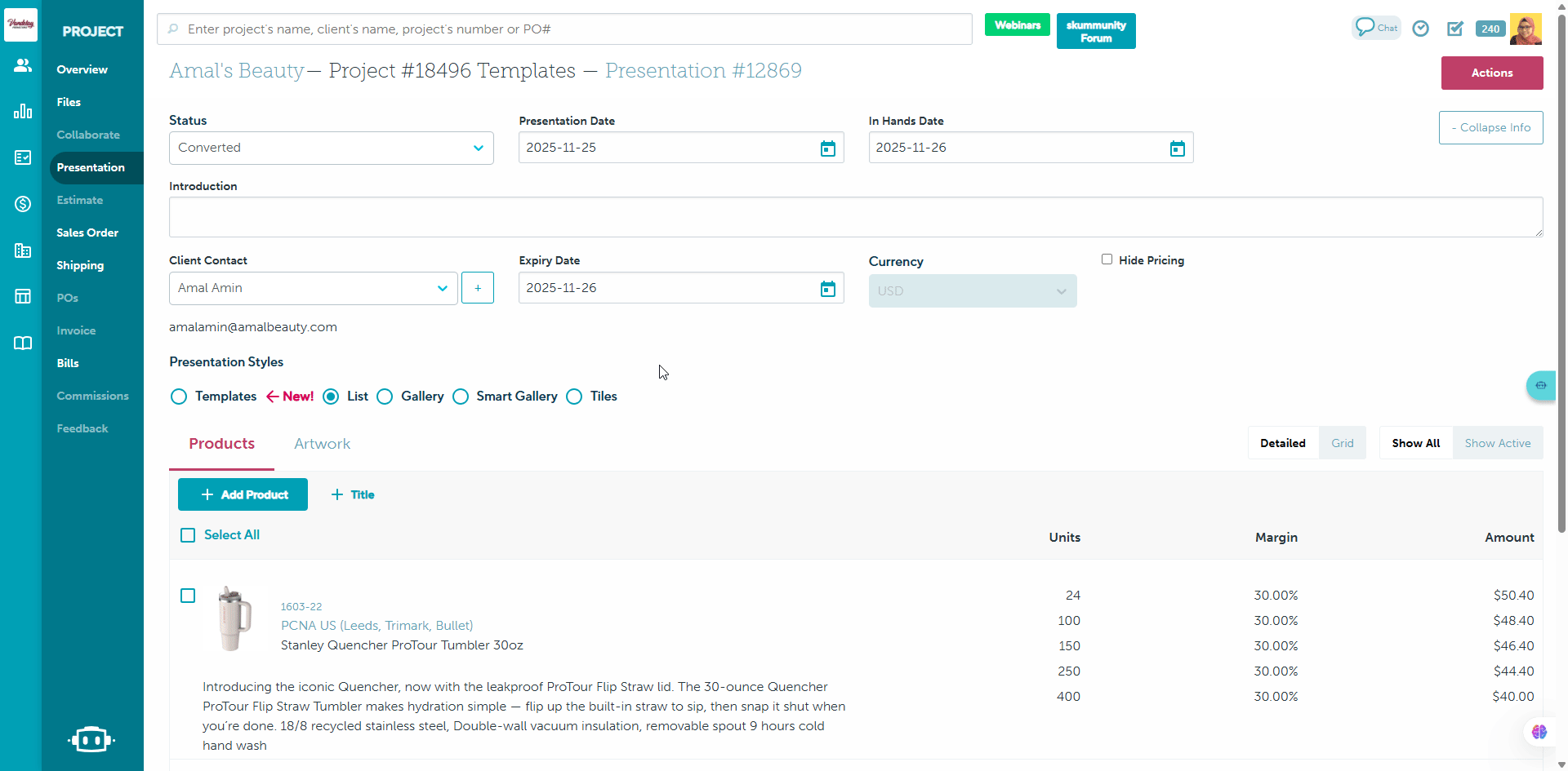 The List style displays each product's information in one spot rather than in separate tabs. Clients can leave comments on individual items while viewing the live version of the presentation.